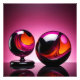 Zwei Glaskugeln – eine kleinere auf einem Podest und eine größere auf einem glasigen Untergrund ruhend – zeigen lebendige Farbmuster in Orange, Schwarz und Pink.