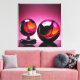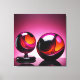 Zwei Glaskugeln – eine kleinere auf einem Podest und eine größere auf einem glasigen Untergrund ruhend – zeigen lebendige Farbmuster in Orange, Schwarz und Pink.
