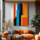 Dieses abstrakte Stück weist vertikale Blöcke in lebhaften Orange-, Blau-, Schwarz- und Weiß-Tönen auf und schafft eine harmonische und auffällige Komposition. Perfekt für moderne Räume, strahlt es Energie und Gleichgewicht durch Farbe und Geometrie aus.