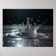 Eine atemberaubende Hochgeschwindigkeits-Aufnahme eines flüssigen Splash, gerendert mit einer futuristischen und metallischen Ästhetik. Der Splash schafft eine perfekte Kronenform mit einem Tröpfchen, das von der Mitte aufsteigt. Die Flüssigkeit hat eine hochreflektierende, chrome Oberfläche, die das Umgebungslicht in Rot- und Blautönen einnimmt und ihm ein elegantes, sci-fi-Ambiente verleiht. Tropfen der Flüssigkeit werden in der Luft aufgehängt und erzeugen gleichzeitig ein Gefühl der dynamischen Bewegung und Stille vor einem dunklen, minimalistischen Hintergrund.