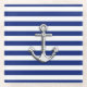 Ein silberfarbener Chrom wie Anchor sieht auf einem Nautical Navy Blue Stripes auf einem benutzerdefinierten Untersetzer aus Glas. Einführung