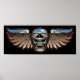 Geklirter Chromskull mit Flügeln, die eine Wüstenautobahn mit klarem, blauen Himmel reflektieren. Tinte und Airbrush-Kunst auf T - Shirt, Hoodies, Plakaten, Geschenken.