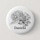 Black on white line art drawing of two Chrysanthemum flowers with a sprig of fern and a personalized name. This is original hand drawn art from Dogwood & Thistle Art and Design.