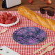 Teller mit farbenfroher Blumenmalerei, blühende Chrysanthemum-Blume. Farbpalette: Deluge Violet, Martinique Blue, Hopbush Rose, Amethyst, Lavendel, Rosa, Magenta. © Clipso-Callipso / Julia Khoroshikh www.clipsocallipso.ar #floralart #chrysanthemum #paperplate #partydecor $weddingdecor #weddingdecor