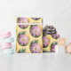 Die hübsche, blühende Geschenkpackung ist mit Blumenmustern geschmückt, die eine lila-rosa und cremig-weiße Chrysanthemum-Blüte mit einem Knospen- und Blätterdach vor goldfarbenem Ocker und Olivgrün auf einem buttergelben Hintergrund darstellen.