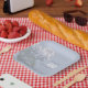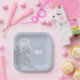 Botanische Kontur Grafik zeichn von Chrysanthemum weißen Blume mit grün grauen Blätter auf einem personalisierten Hochzeitsquadrat Papier Teller. Passen Sie Ihre Braut und Bräutigam an und lassen Sie sich von Ihrem Hochzeitstermin überraschen. Drucken einer von Sarah Trett gezeichnet grafischen Kontur. www.sarahtrett.com für www.mylittleedenweddings.com