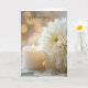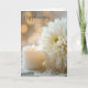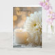 Eine glühende Kerze sitzt neben einer großen, weichen Chrysanthemum-Blume auf einer Spitzenfläche, umgeben von warmen Bokeh-Lichtern im Hintergrund für eine Hochzeit oder Jubiläum Gratulationen. Alle Texte können geändert werden.