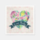 Papierservietten mit individualisierbarem Text, in dem steht: "Ciao Bella", in gebogenem Text in einem blau-grünen Farbband, das über einem skurrilen Herz mit tropischen Blume und Blätter in Rosa, Grün und Gelb liegt. Der Hintergrund ist ein verblasstes Muster mit Kreisen in hellrosa und weiß. Klänglich und skurril.