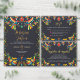 Dieses farbenfrohe mexikanische Cinco de Mayo Fiesta Wedding Invitation Design präsentiert ein lebendiges mexikanisches Folk Art inspiriert Thema mit bunten Vögeln, Blume und einem zentralen Herzmotiv. Die hellen Rot-, Gelb-, Blau- und Grüntöne heben sich von der schwarzen Hintergrundfarbe ab und sorgen für ein festliches und lebendiges Ambiente. Die symmetrische Anordnung der Vögel und Blume verleiht Ausgeglichenheit und Harmonie, ideal für Hochzeitseinladungen oder Feierlichkeiten.