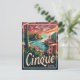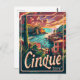 Eine lebendige und nostalgische Darstellung von Cinque Terre, Italien, bekannt für seine farbenprächtigen Felsdörfer und atemberaubende Küstenaussichten. Das Design vereint die malerischen Städte Monterosso, Vernazza, Corniglia, Manarola und Riomaggiore, die sich an schroffen Felsen über dem azurblauen Mittelmeer befinden. Das Vintage Kunstwerk erinnert an die reizvolle und landschaftliche Schönheit der Cinque Terre und lädt die Besucher ein, ihre einzigartige Landschaft und ihren Küstennutzen zu erkunden.
