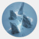 Four ancient stones rise from the snow, encircled by a glowing trail of ethereal light.