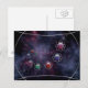 Eine Illustration der Unendlichkeit, das Überqueren des Universums, um das Mikroskop und das Teleskop in einer Regenbogendarstellung von Formen und Farben zu kombinieren. Eine Kolumne mehrfarbiger Atome aus Blau, Rosa, Rot und Grün, umgeben von silbernen Ringen, die sich vor dem Hintergrund farbenfroher Fraktal-Galaxien über den Weltraum spiralförmig bewegen.