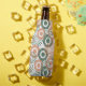 Diese Flasche cooler hat ein Design von Kreisen mit Linien und Kreise aus wiederholt Punkten in Retro-Grün und Korallen dekoriert.