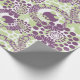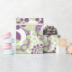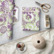 Dieses Verpackungspapier hat ein Design von Kreisen mit Linien und Kreisen aus wiederholten Punkten in Auberginen und Grün dekoriert.