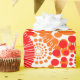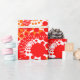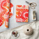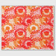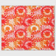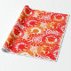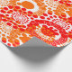 Dieses Verpackungspapier hat ein Muster von Kreisen, die mit Linien und Kreisen aus wiederholenden Punkten in Rot und Orange dekoriert sind.