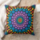 Kopfkissen mit einem Design von vielen verschiedenen Kreisen in verschiedenen Größen. Vielfarbig mit Rosa und Farben des Regenbogens auf schwarzem Hintergrund. Design von Angela Hoard Dunn