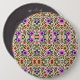 Circular pin badge with intricate floral pattern. Features purple, orange, and green flowers on a beige background. Backside shown with pin attachment.