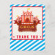 Schicken Sie eine Dankeschön-Karte an Ihren schönen Gast mit unserem blauen und roten Zirkus Geburtstagsparty Dankeschön Postcard. Entworfen wurde ein Zirkuszelt auf Streifen blauen Hintergrund. Die Hintergrundfarbe ist vollständig editierbar, klicken Sie auf Anpassen, um das Farbdesign zu ändern.