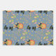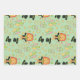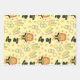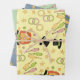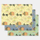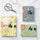 Fun kids birthday wrapping paper sheets with the pattern if a circus lion and some juggler's props . One is yellow , one is blue and one is green .