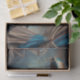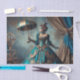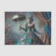 Eine wunderschöne Vintage Steampunk-Viktorianische Zirkusspielerin in verziertem Blau und Gold mit Uhrwerk, die in ihr elegantes Kleid eingewoben ist, steht mit ihrem Sonnenschirm in dieser Vintagen historischen Fantasiewelt. Dies ist perfekt für Handwerkskunst wie DecoPage!