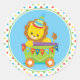 Dieser Zirkusmotiv-Aufkleber weist einen blauen Hintergrund auf, der von einem sich wiederholenden Fleck roter, blauer, gelber und grüner Sterne umgeben ist. Ein grünes Zugfahrzeug mit einem niedlichen Löwen, das ein Party trägt, das in der Mitte des Aufklebers sitzt. Dieses Design ist Teil meiner Sammlung "Circus Themed Birthday Party". Clip Art von Prettygrafik Design etsy.com/shop/Prettygrafikdesign