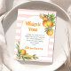 Orange Citrus Little Süsse 1. Geburtstag Dankeschön-Karte Niedlich unsere kleine Süsse ersten Geburtstag dank Ihnen Karte mit einigen Zitrusfrüchten und floralen Arrangements, weißen Bogen und ein rosa und weiß gestreiften Hintergrund.