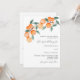Ein weißer Hintergrund. Die Einrichtung ist mit Orangen in Aquarellen geschmückt. Personalisieren und fügen Sie einen Namen und Party-Details hinzu. Zurück: Fügen Sie Ihre Hochzeitswebsite url zum QR-Code für Details und/oder UAWG hinzu.