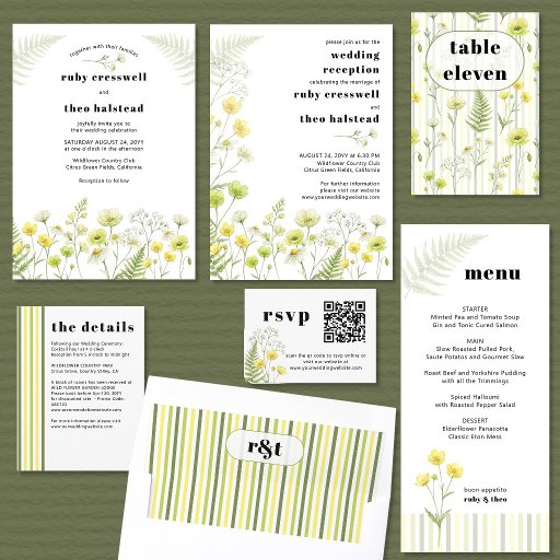 Keep your guests informed with this stylish "Details" enclosure card. The front features the signature preppy vertical stripes of our Citrus Wildflower collection, in citrus green and buttercup yellow, paired with modern, bold serif typography. The reverse side is a beautiful "moment," showcasing an all-over, hand-painted wildflower and fern pattern. This card is perfect for sharing accommodation blocks, travel logistics, and wedding website information for your upscale garden or outdoor celebration.