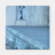 Blaue Urbanität - ein Foto einer Unterführung zwischen einer Straße und dem Hafen in Wellington, Neuseeland. Auf einem Paneel unter der Brücke versteckt ist ein kleines Graffiti im Stil von Banksy, das eine Frau in einem langen Kleid, Kopftuch und Schürze zeigt, die einen Tank mit "C" auf sich trägt.