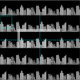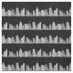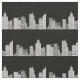 Ein zeichn einer City-Skyline bildet ungebrochene blassfarbene Streifen gegen einen schwarzen Nachthimmel. Die Gebäude und Wolkenkratzer sind in durchsichtigem Weiß und Schwarz gezeichnet, sodass, wenn Sie die Hintergrundfarbe ändern, die Farbe der Stadt ändert, um sie zu ergänzen. Dies wäre ein gutes Muster für Quilting, Masken und andere handwerkliche Projekte. Die Stadt konnte in Streifen für Grenzen geschnitten werden.