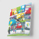 Künstler: Marcus Cutler | Veranschaulichung einer belebten Stadt- und Bushaltestelle mit Fußgängern und Autos, LKW und Läden und einem Jungen auf dem Fahrrad