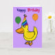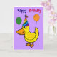 Die lustige Cartoon-Ente mit einem Geburtstagshut mit Ballons Geburtstagskarte sagt Happy Birthday und innen sagt: Hoffe, dein Geburtstag ist nur Ducky!
