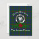 Stilvolle Weihnachts-Postkarte mit schottischem Clan Agnew Wappen-Abzeichen und anpassbarem Text auf tartan Hintergrund mit Poinsettia und Tannenbuss.