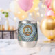Clan Bell Wappen Abzeichen umgeben von einem Gurt und Schnalle über Tartan Hintergrund. Benutzerdefinierter Text auf beiden Seiten.