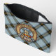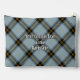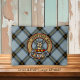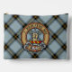 Clan Bell Wappen Abzeichen umgeben von einem Gurt und Schnalle über Tartan Hintergrund. Benutzerdefinierter Text auf beiden Seiten.