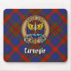 Clan Carnegie Wappen Abzeichen umgeben von einem Gurt und Schnalle über Tartan Hintergrund. Eigener Text.