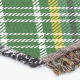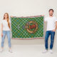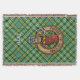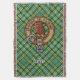 Clan Currie rooster crest badge surrounded by a strap and buckle over tartan background. Custom text.