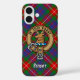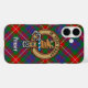 Clan Fraser von Lovat Wappen Abzeichen umgeben von einem Gurt und Schnalle über Tartan Hintergrund. Benutzerdefinierter Text.