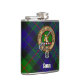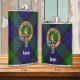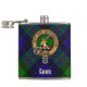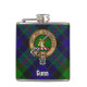 Clan Gunn Wappen Abzeichen umgeben von einem Gurt und Schnalle über Tartan Hintergrund. Eigener Text.