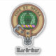 Clan MacArthur Wappen Abzeichen umgeben von einem Gurt und Schnalle über Tartan Hintergrund. Eigener Text.
