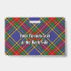 Clan MacBeth Wappen Abzeichen umgeben von einem Gurt und Schnalle über Tartan Hintergrund. Benutzerdefinierter Text auf beiden Seiten.