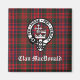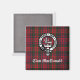 Square Magnet mit schottischem Clan MacDonald Wappen Abzeichen auf rotem, modernem Clan Tartan Hintergrund.