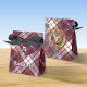 Clan MacFarlane Wappen Abzeichen umgeben von einem Gurt und Schnallen über Kleidertartan. Benutzerdefinierter Text und Monogramm.