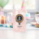 Clan MacKay Wappen Abzeichen umgeben von einem Gurt und Schnalle über Tartan Hintergrund. Benutzerdefinierter Text auf beiden Seiten.