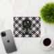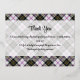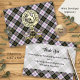 Clan MacPherson crest badge surrounded by a strap and buckle over dress tartan background. Foil printed thank you card. Custom text.