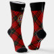 Clan MacQueen Wappen Abzeichen umgeben von einem Gurt und Schnalle über Tartan Hintergrund. Benutzerdefinierte Farbe des oberen Streifens. Benutzerdefinierter Text auf jeder Socke.