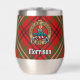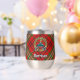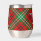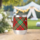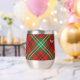 Clan Morrison Wappen Abzeichen umgeben von einem Gurt und Schnallen über rot Tartan Hintergrund. Benutzerdefinierter Text auf beiden Seiten.