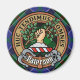 Clan Paterson Wappen Abzeichen umgeben von einem Gurt und Schnalle über Tartan Hintergrund. Eigener Text.