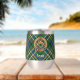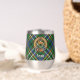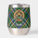 Clan Scott Wappen Abzeichen umgeben von einem Gurt und Schnallen über grünem Tartan Hintergrund. Benutzerdefinierter Text auf beiden Seiten.
