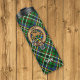 Clan Scott Wappen Abzeichen umgeben von einem Gurt und Schnallen über grünem Tartan Hintergrund. Eigener Text.